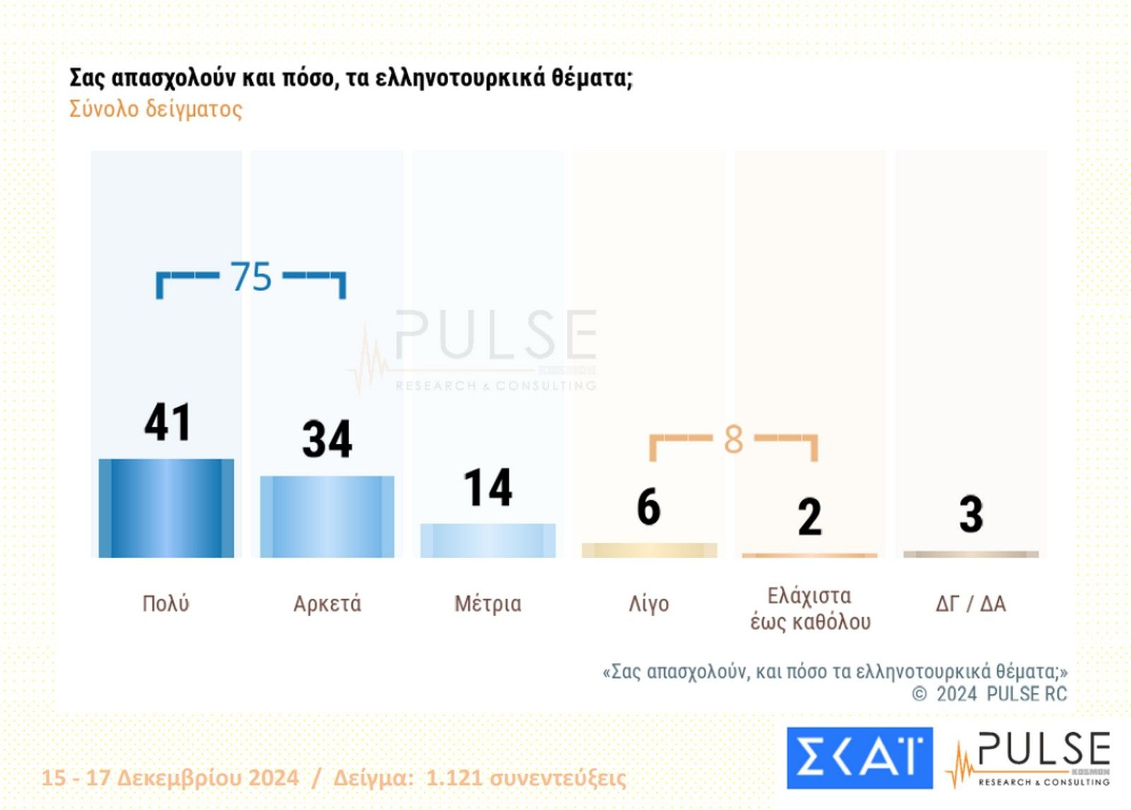 Το 75% ανησυχεί πολύ για τα ελληνοτουρκικά, ενώ το 8% δεν ανησυχεί.