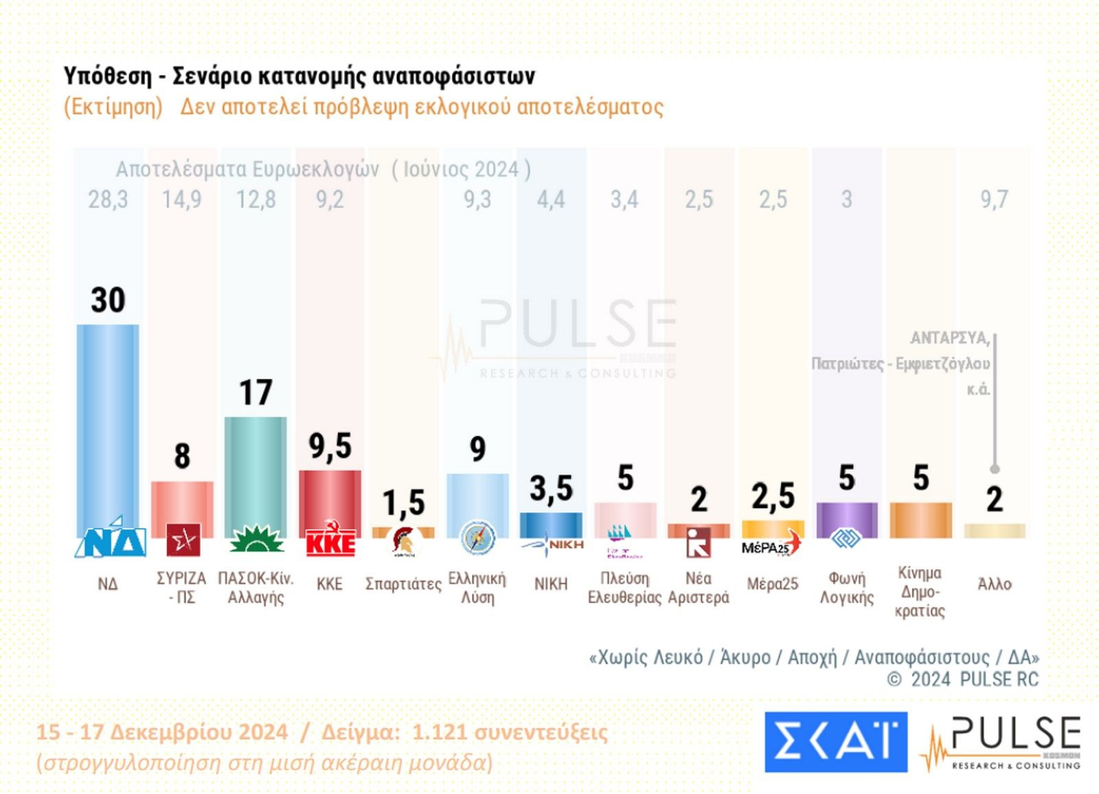 Η Νέα Δημοκρατία δείχνει να παραμένει σε ένα ποσοστό γύρω στο 30%, διατηρώντας διαφορά 13 μονάδων από το δεύτερο ΠΑΣΟΚ στην αναγωγή των αναποφάσιστων.