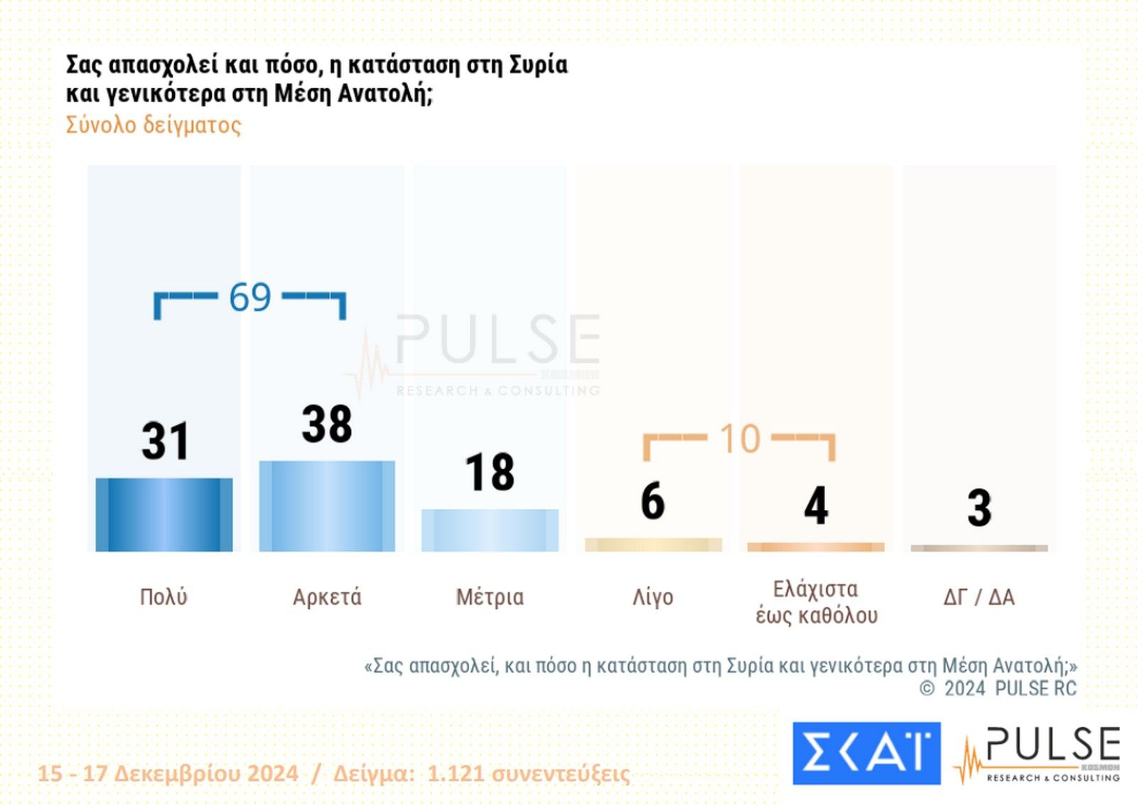 Στο μεταξύ, το 69% απαντά πως το απασχολεί η κατάσταση στη Μέση Ανατολή, ενώ το 10% απαντά πως δεν το απασχολεί.