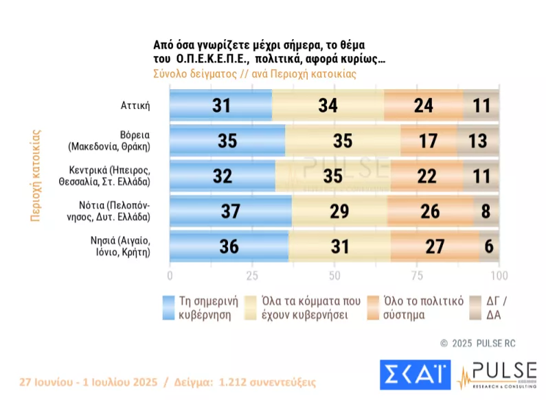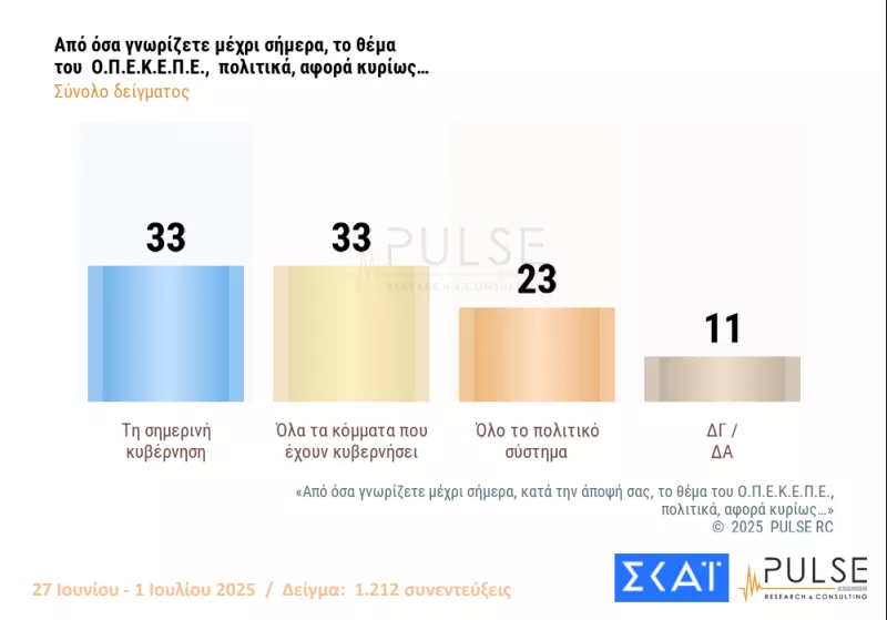 Στο ερώτημα «ποιους αφορά το κυρίως το θέμα του ΟΠΕΚΕΠΕ», το 33% απάντησε τη σημερινή κυβέρνηση, ενώ το ίδιο ποσοστό (33%), απάντησε ότι αφορά όλα τα κόμματα.