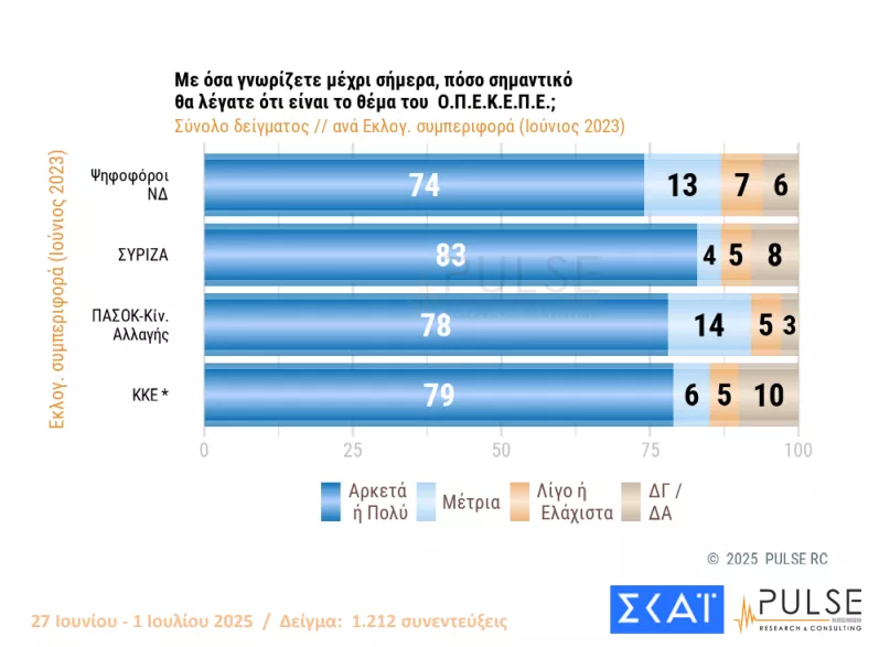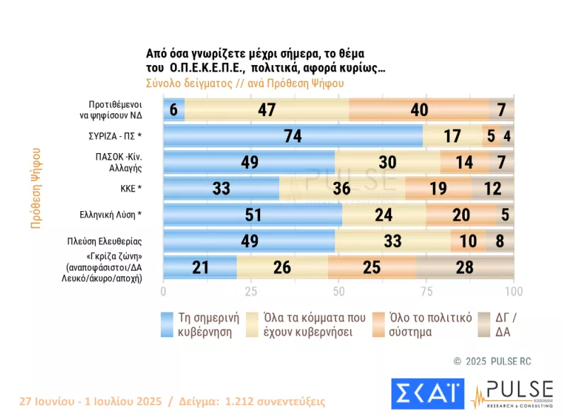 Το σκάνδαλο του ΟΠΕΚΕΠΕ και το αποτύπωμα που αφήνει στην κοινή γνώμη και στις επιλογές των ψηφοφόρων αναδεικνύει η δημοσκόπηση της Pulse, η οποία παρουσιάστηκε στο κεντρικό δελτίο ειδήσεων του ΣΚΑΪ, το βράδυ της Τετάρτης (2/7).