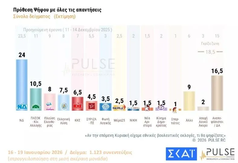 Δημοσκόπηση Pulse: Ξεπερνά τις 16 μονάδες το προβάδισμα ΝΔ – Τι “μαζεύουν” Τσίπρας, Σαμαράς, Καρυστιανού