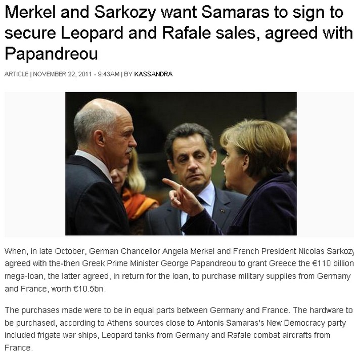 Στο δημοσίευμα υπογραμμίζεται ότι τα δανεικά προς την Ελλάδα και η επιμονή για την υπογραφή της δανειακής σύμβασης από τον πρόεδρο της αξιωματικής αντιπολίτευσης Αντώνη Σαμαρά, συνδέεται άμεσα με πωλήσεις οπλικών συστημάτων ύψους 10.5 δις ευρώ. Η αγορά φέρεται να έρχεται ως αντάλλαγμα για τα δάνεια που η Ευρώπη παραχωρεί “απλόχερα” στη χώρα μας.