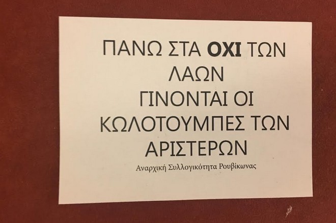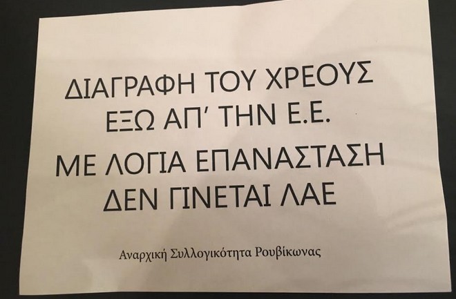“Παρέμβαση του Ρουβίκωνα τώρα στήν εκδήλωση του Τμήματος Οικονομικής Πολιτικής του ΣΥΡΙΖΑ (με ομιλητές τον υπουργό Οικονομικών, και τον Υπουργό Οικονομίας στο ξενοδοχείο ΤΙΤΑΝΙΑ.