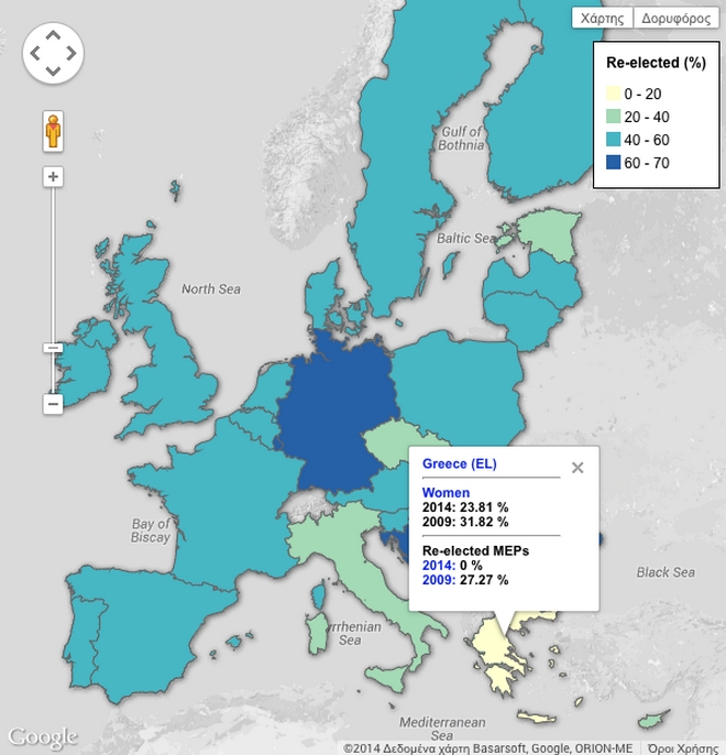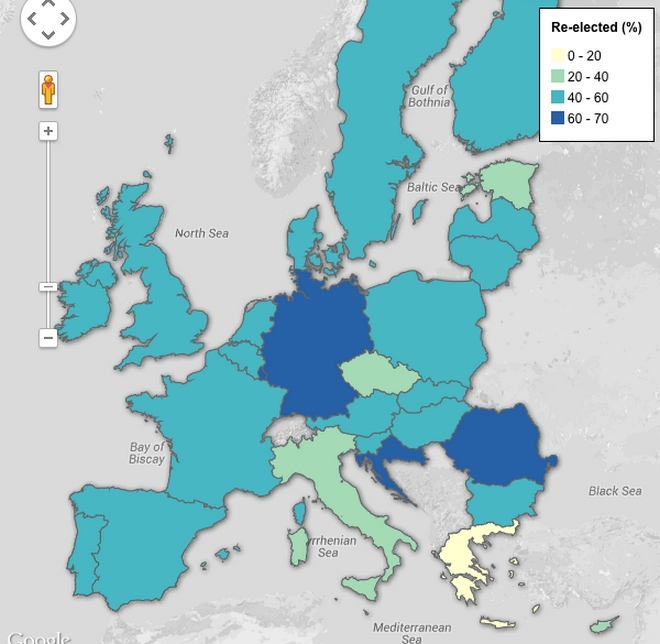Μικρή πτώση σημείωσε το ποσοστό των ευρωβουλευτών που επανεξελέγησαν. Από 49,59% το 2009 έπεσε στο 49,4% στις εκλογές του Μαΐου του 2014.