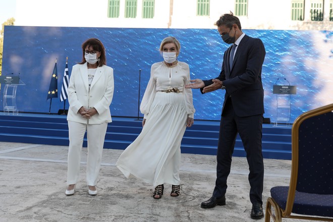 Το «παρών» στην εκδήλωση έδωσαν ο πρωθυπουργός Κυριάκος Μητσοτάκης και η σύζυγός του Μαρέβα Γκραμπόφσκι.