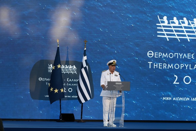 «Ο ελλαδικός χώρος και ο ελληνικός κόσμος», είπε ο αντιναύαρχος, «είχε το προνόμιο να φιλοξενήσει σε πολύ μικρό χρονικό διάστημα δύο τέτοιες στιγμές. Τη μάχη των Θερμοπυλών, που απέδειξε ότι ο αγώνας για την ελευθερία δεν υπόκειται στη λογική των αριθμών. Και την αποφασιστική αναμέτρηση της ναυμαχίας της Σαλαμίνας που κατήγαγε την τελική νίκη για την Ελλάδα και την Ευρώπη».