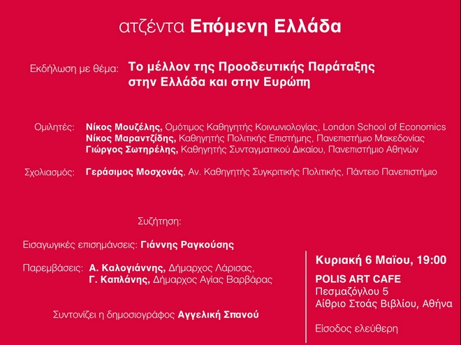 Ομιλητές στην εκδήλωση θα είναι οι καθηγητές Νίκος Μουζέλης, Νίκος Μαραντζίδης και Γιώργος Σωτηρέλης, ενώ αναμένεται να κάνει παρέμβαση και ο δήμαρχος Λαρισαίων Απόστολος Καλογιάννης. Παρουσιάζει η Αγγελική Σπανού.