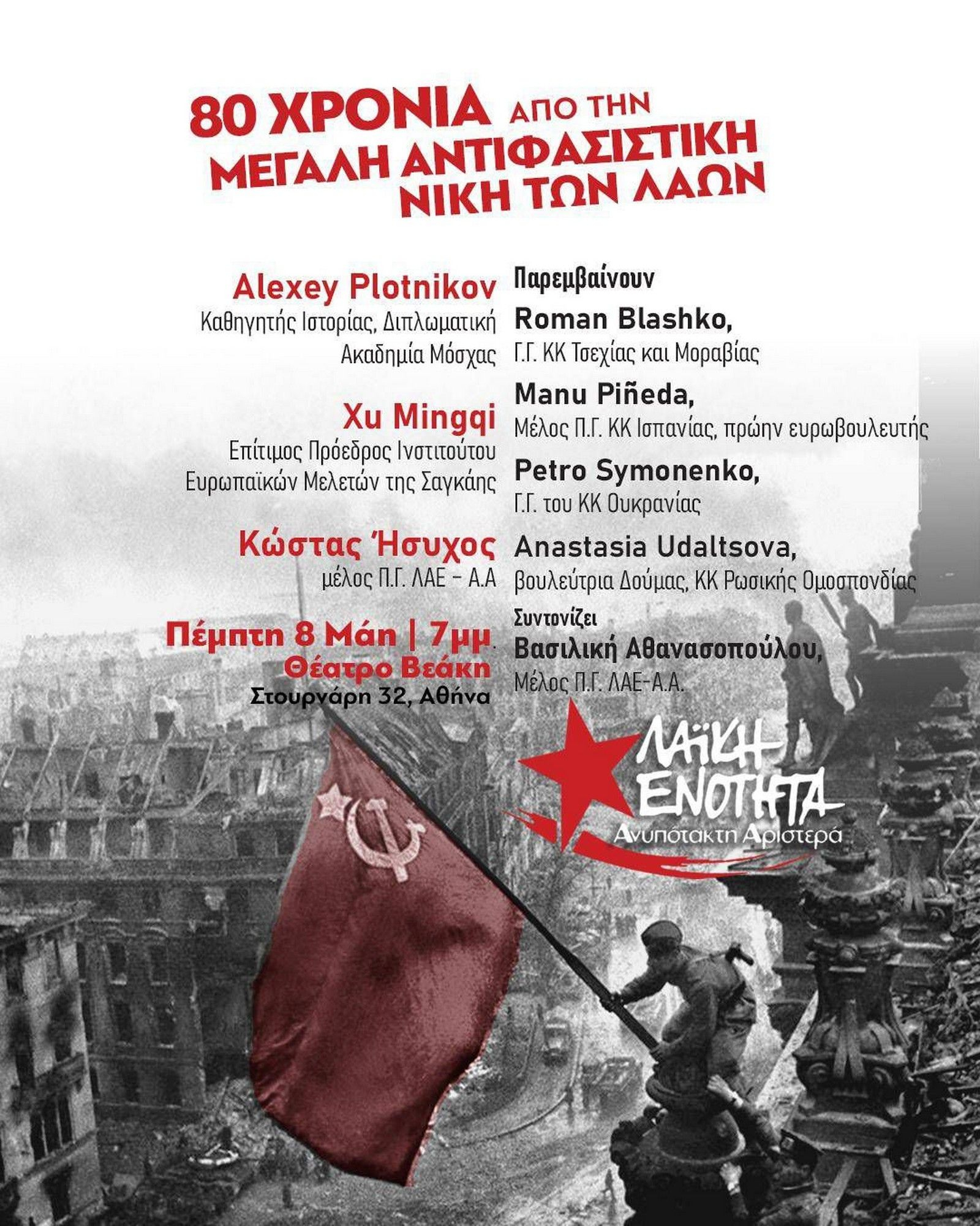 Η Λαϊκή Ενότητα – Ανυπότακτη Αριστερά διοργανώνει εκδήλωση την Πέμπτη (08/05) σε κεντρικό θέατρο της Αθήνας, αφιερωμένη στα 80 χρόνια από τη μεγάλη αντιφασιστική νίκη των λαών.