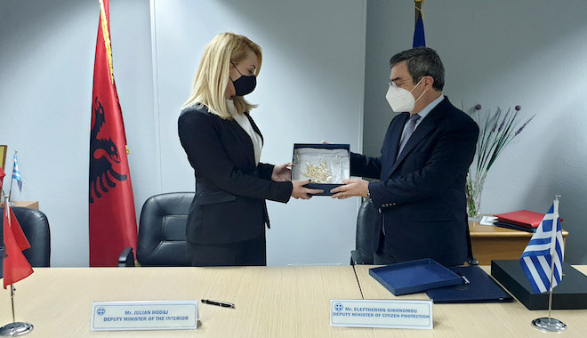 Τη Συμφωνία υπέγραψαν ο υφυπουργός Προστασίας του Πολίτη, Λευτέρης Οικονόμου και ο υφυπουργός Εσωτερικών της Αλβανίας, αρμόδιος επί θεμάτων διαχείρισης συνόρων, Julian Hodaj.