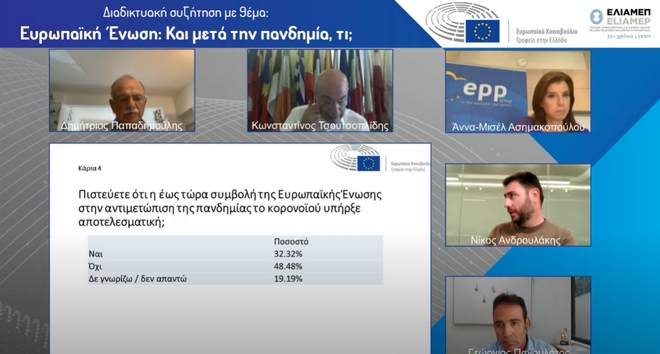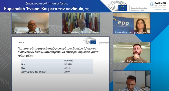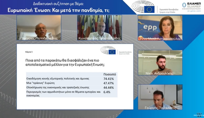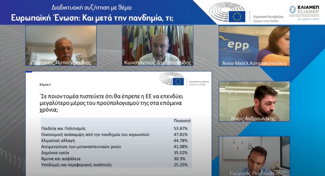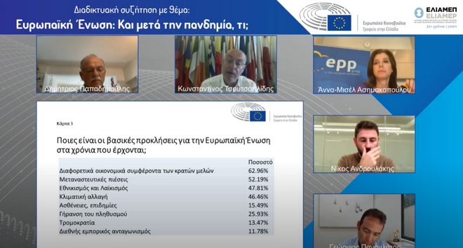 Παράλληλα, παρουσιάστηκαν τα ευρήματα του ερωτηματολογίου του Ευρωπαϊκού Κοινοβουλίου στην Ελλάδα σε σχέση με το τι ζητάνε οι πολίτες από την Ένωση, το οποίο ακόμη “τρέχει”.