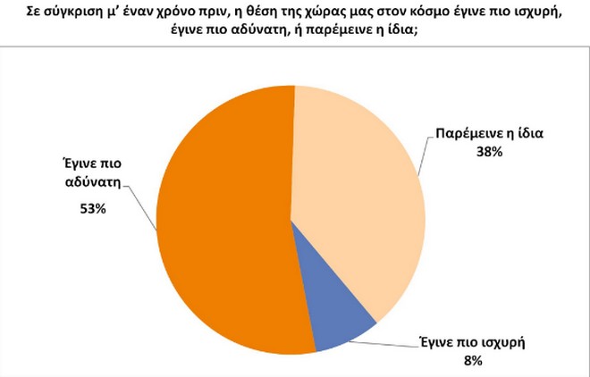 Συγκεκριμένα, το 53% εκτιμά ότι η Ελλάδα έγινε πιο αδύναμη τους τελευταίους δώδεκα μήνες, ενώ μόλις το 8% πιστεύει ότι η θέση της ενισχύθηκε.