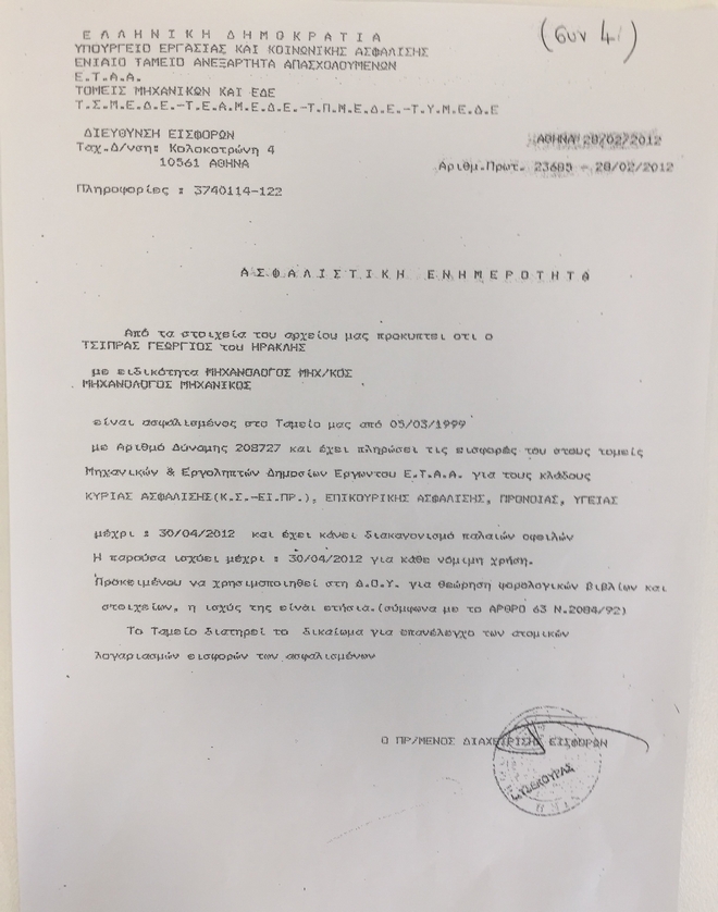 α) δεν εκδόθηκε ποτέ από το ΤΣΜΕΔΕ ασφαλιστική ενημερότητα του κ. Γεωργίου Τσίπρα στις 28/2/2012 με τον αριθμό πρωτοκόλλου που αναγραφόταν στα έγγραφα που κατέθεσε η ΔΙΟΔΟΣ.