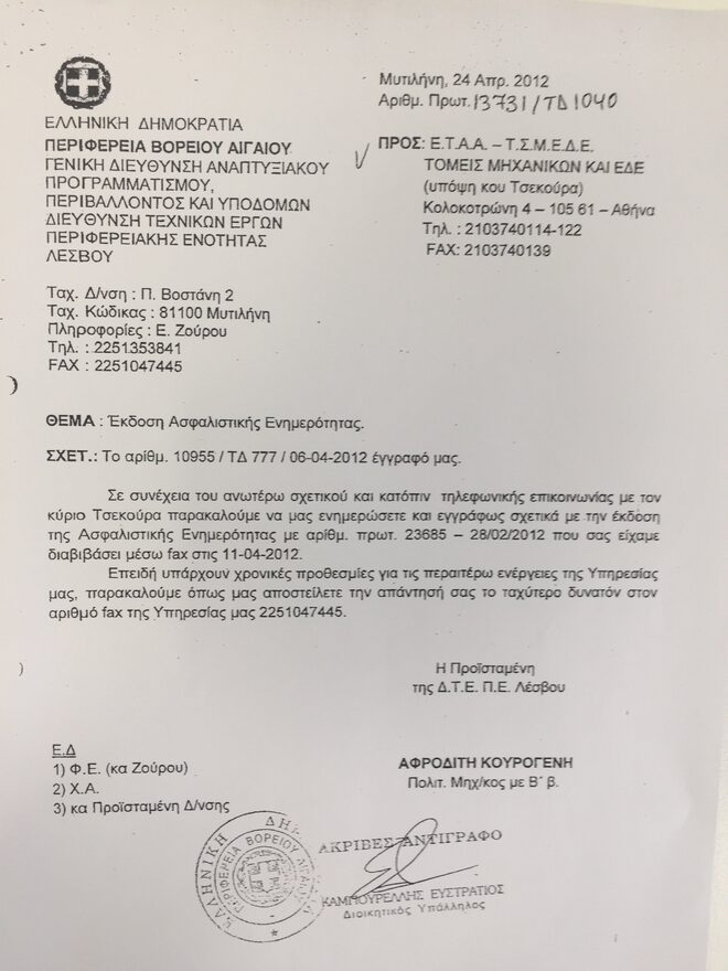 -Εξ αυτού του λόγου η Δ/νση Τεχνικών έργων της Περιφέρειας Βορείου Αιγαίου απευθύνει πλέον επισήμως στο Ε.Τ.Α.Α. – Τ.Σ.Μ.Ε.Δ.Ε., (που φερόταν να έχει εκδώσει τα εν λόγω έγγραφα), γραπτό ερώτημα για να διαλευκανθεί η υπόθεση .