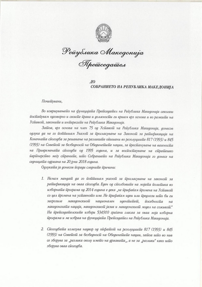 “Eπομένως”, συνεχίζει ο Ιβάνοφ, “αποφάσισα να μην υπογράψω την συμφωνία […] που υιοθέτησε το κοινοβούλιο της «Δημοκρατίας της Μακεδονίας», στις 20 Ιουνίου.