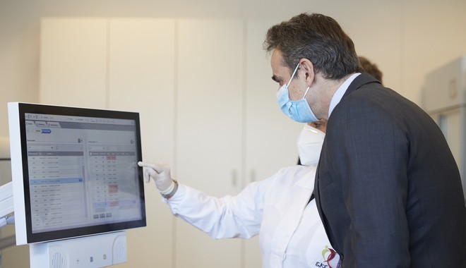 Ακολούθως, ο Κυριάκος Μητσοτάκης ενημερώθηκε για την υλικοτεχνική υποδομή του Κέντρου, η οποία επιτρέπει τη μαζική τέλεση μοριακών ελέγχων αίματος και την έκδοση αποτελεσμάτων εντός λίγων ωρών.