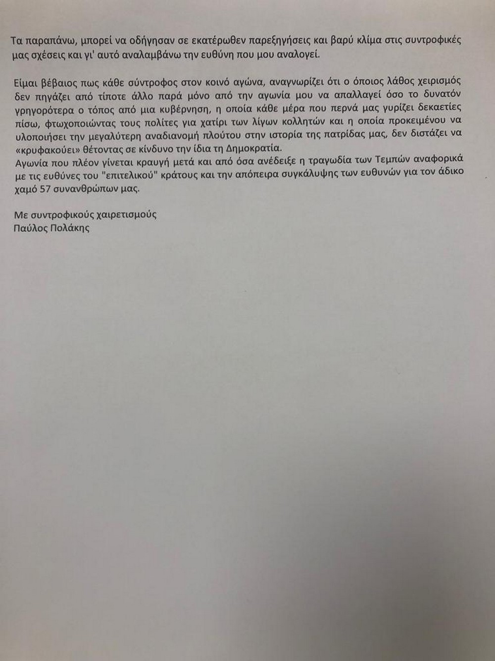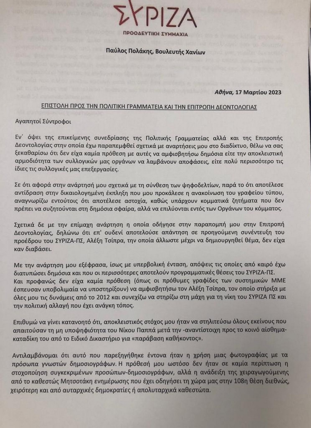 Στην επιστολή του μεταξύ άλλων ο Παύλος Πολάκης σημειώνει αναφορικά με την συνολική συμπεριφορά του πως «θέλω να σας ξεκαθαρίσω ότι δεν είχα καμία πρόθεση με αυτές να αμφισβητήσω δημόσια είτε την αποκλειστική αρμοδιότητα των συλλογικών μας οργάνων να λαμβάνουν αποφάσεις, είτε πολύ περισσότερο τις ίδιες τις συλλογικές μας επεξεργασίες».