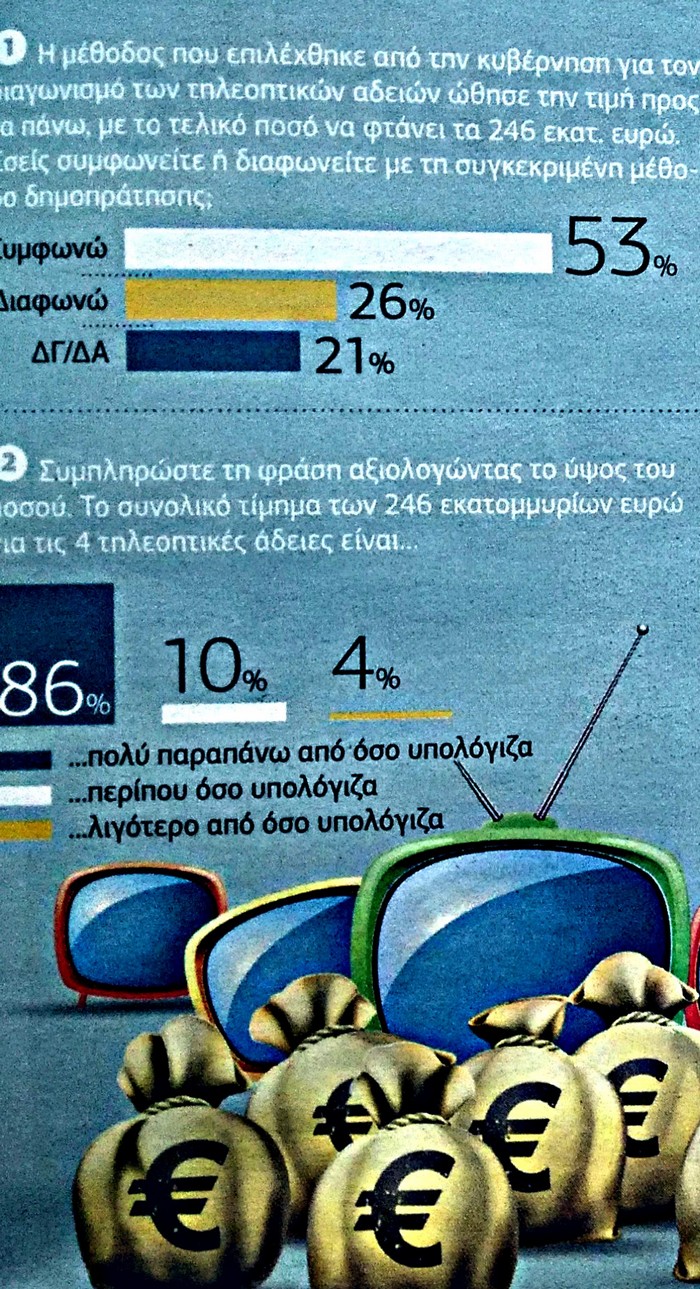 Στο ερώτημα εάν συμφωνούν με τη διαδικασία δημοπράτησης των αδειών που επέλεξε η κυβέρνηση, το 53% απαντά θετικά, το 26% αρνητικά και το 21% λέει «Δεν ξέρω/Δεν απαντώ». Ως προς το συνολικό τίμημα που θα καταβάλουν οι καναλάρχες, το 86% δηλώνει ότι είναι «πολύ παραπάνω απ’ όσα υπολόγιζα», το 10% «περίπου όσα υπολόγιζα» και το 4% «λιγότερα απ’ όσα υπολόγιζα».