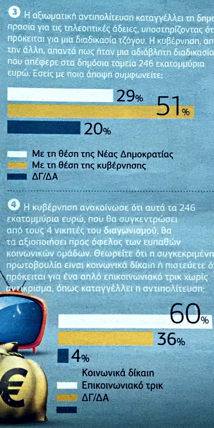 Πάντως, οι πολίτες μοιάζουν να πιστεύουν πως οι εξαγγελίες του πρωθυπουργού πως τα έσοδα από τη δημοπρασία θα διατεθούν προς όφελος των ευπαθών κοινωνικών ομάδων είναι επικοινωνιακό τρικ (60%), ενώ μόλις 4% μιλούν για κοινωνική δίκαιη λύση. Στο ίδιο επικριτικό πνεύμα προς τους πολιτικούς, οι ερωτηθέντες απαντούν πως οι προηγούμενες κυβερνήσεις προτιμούσαν να συντηρούν το τρίγωνο της διαπλοκής “κανάλια-τράπεζες-πολιτικοί” σε ποσοστό 75%, από το να θέσουν όρους και να διεξάγουν διαγωνισμό για τις άδειες.