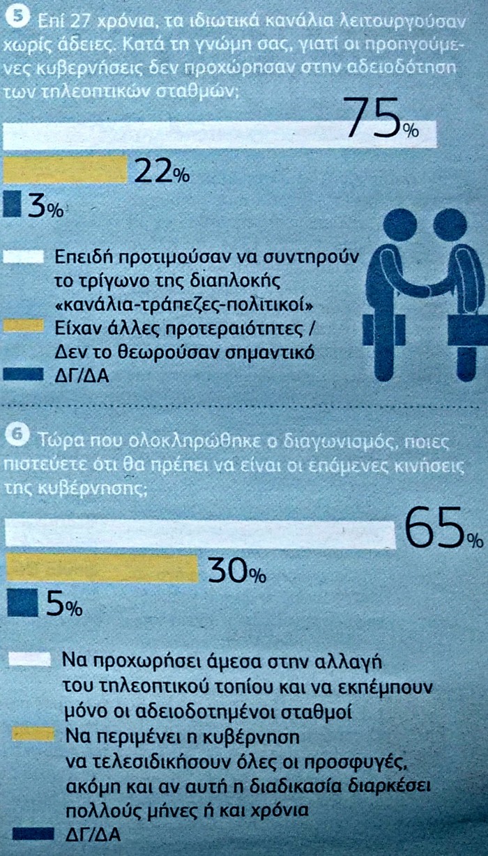 Έρευνα της κοινής γνώμης που δημοσιεύει η Εφημερίδα των Συντακτών δείχνει πως οι πολίτες πιστεύουν στη συντριπτική τους πλειοψηφία πως η διαδικασία των τηλεοπτικών αδειών άργησε 27 ολόκληρα χρόνια γιατί συντηρούνταν το τρίγωνο το διαπλοκής