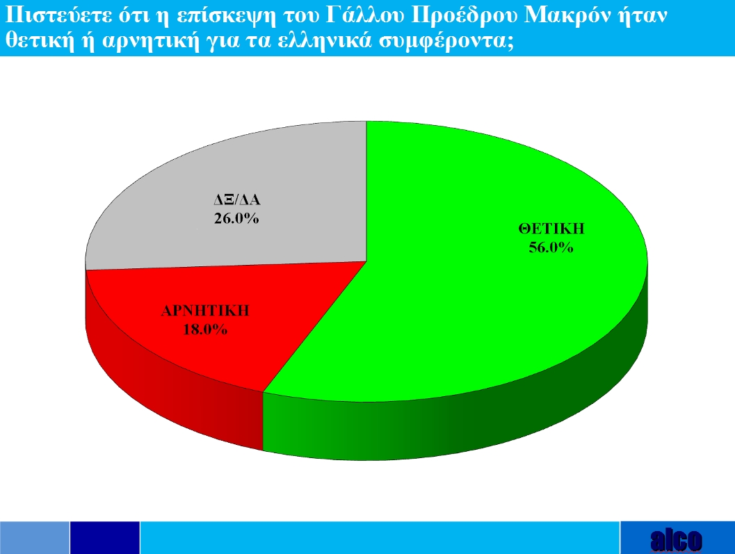 Ειδικότερα, το 56% θεωρεί ότι η επίσκεψη του Γάλλου Προέδρου Εμμανουέλ Μακρόν ήταν θετική για τα ελληνικά συμφέροντα, το 18% αρνητική και το 26% δεν ξέρει/δεν απαντά.