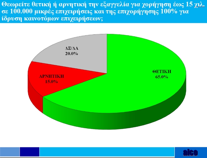 Το 65% θεωρεί θετική την εξαγγελία για χορήγηση έως 15.000 ευρώ σε 100.000 μικρές επιχειρήσεις και της επιχορήγησης 100% για ίδρυση καινοτόμων επιχειρήσεων. Το 15% θεωρεί αυτή την εξαγγελία αρνητική. Το 20% δεν ξέρει/ δεν απαντά.