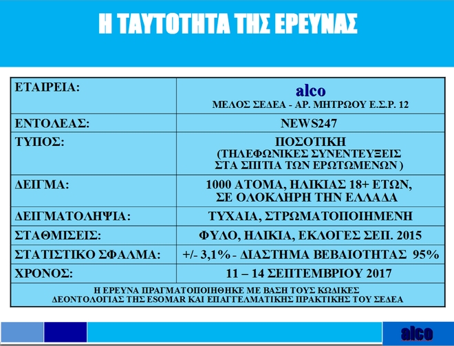 Η έρευνα πραγματοποιήθηκε το διάστημα 11- 14 Σεπτεμβρίου και συνεπώς αποτυπώνει την πρώτη αντίδραση της κοινής γνώμης στην επίσκεψη Μακρόν στις 7 και 8 Σεπτεμβρίου και της παρουσίας Τσίπρα στη Θεσσαλονίκη στις 9 και 10 Σεπτεμβρίου.