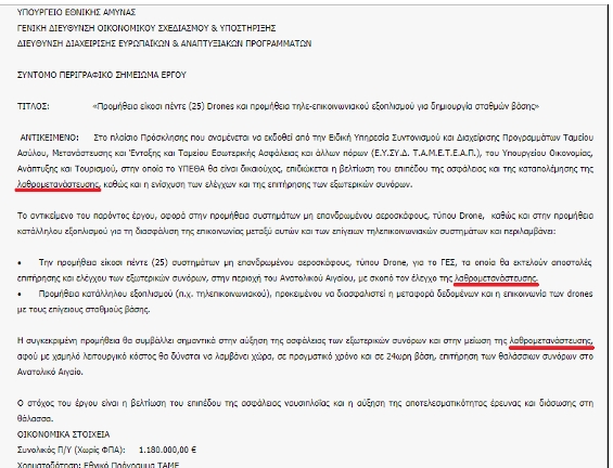 Ειδικότερα οι ερωτώντες βουλευτές αναφέρουν ότι: “Ο όρος «λαθρομετανάστευση» χρησιμοποιείται συστηματικά στο κείμενο της Διαβούλευσης του ΥΠΕΘΑ (της Γενικής Διεύθυνσης Οικονομικού Σχεδιασμού και Υποστήριξης και της Διεύθυνσης Διαχείρισης Ευρωπαϊκών και Αναπτυξιακών Προγραμμάτων) σχετικά με την προμήθεια είκοσι πέντε (25) Drones και τηλεπικοινωνιακού εξοπλισμού για δημιουργία σταθμών βάσης της Ειδικής Υπηρεσίας Συντονισμού και Διαχείρισης Προγραμμάτων Ταμείου Ασύλου, Μετανάστευσης και Ένταξης και Ταμείου Εσωτερικής Ασφάλειας και άλλων πόρων (Ε.Υ.ΣΥ.Δ. Τ.Α.Μ.Ε.Τ.Ε.Α.Π.) του Υπουργείου Οικονομίας, Ανάπτυξης και Τουρισμού, στην οποία το ΥΠΕΘΑ θα είναι δικαιούχος.”