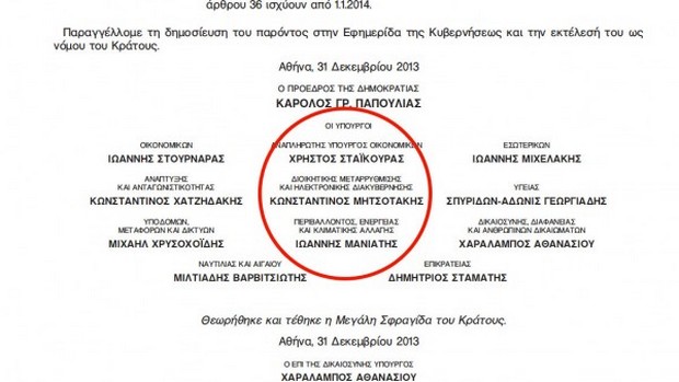 Αντί για το όνομα του υπουργού Διοικητικής Μεταρρύθμισης, Κυριάκου Μητσοτάκη, στο ΦΕΚ υπουργός “χρίστηκε” ο πατέρας του, πρώην πρωθυπουργός και επίτιμος πρόεδρος της ΝΔ, Κωνσταντίνος.