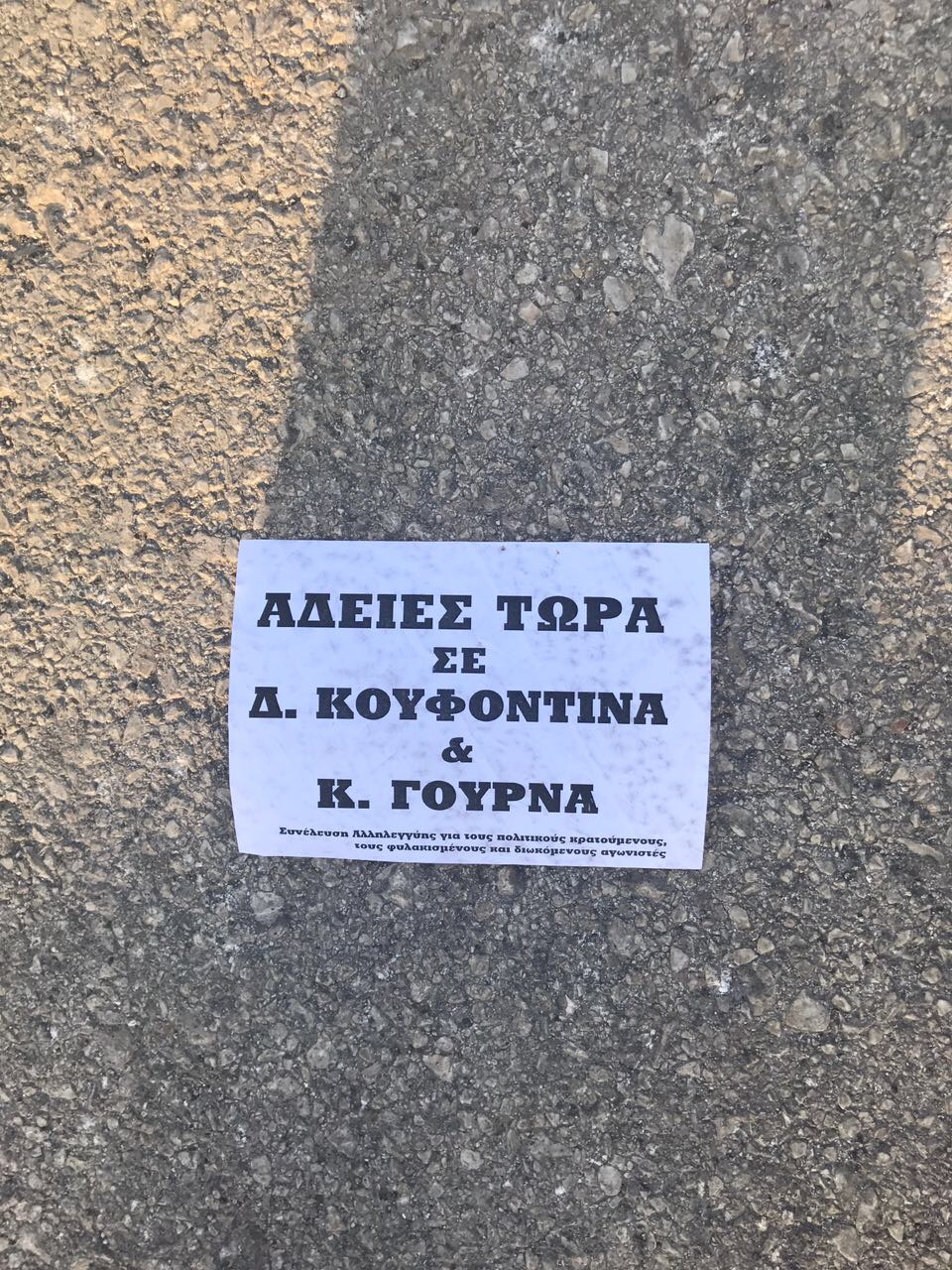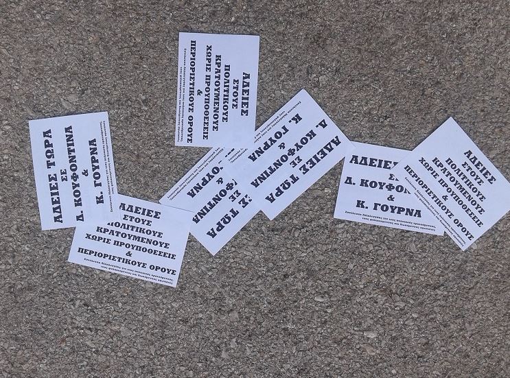 “Παρέμβαση έγινε πριν από λίγη ώρα έξω από το σπίτι της Ν. Μπακογιάννη από τη Συνέλευση Αλληλεγγύης για τους πολιτικούς κρατούμενους, τους φυλακισμένους και διωκόμενους αγωνιστές για το ζήτημα των αδειών στους πολιτικούς κρατούμενους. Ανοίχτηκε πανό, πετάχτηκαν τρικάκια, φωνάχτηκαν συνθήματα και μοιράστηκε το παρακάτω κείμενο: