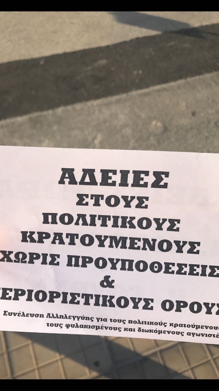 Φωτογραφίες και σχετικό κείμενο ανέβασε σε γνωστή ιστοσελίδα του αντιεξουσιαστικού χώρου η αυτοαποκαλούμενη “Συνέλευση Αλληλεγγύης για τους πολιτικούς κρατούμενους, τους φυλακισμένους και διωκόμενους αγωνιστές” το οποίο και ακολουθεί:
