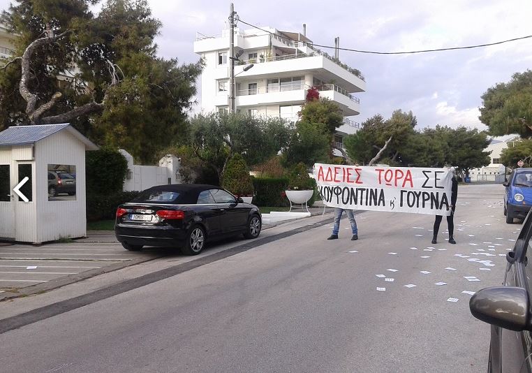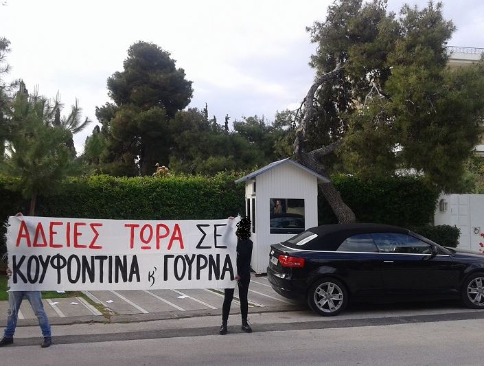 Στα πλαίσια αυτά πραγματοποιήσαμε παρέμβαση έξω από το σπίτι της Ντόρας Μπακογιάννη. ηγετικού στελέχους της Ν.Δ. σε ότι αφορά τις άδειες στους πολιτικούς κρατούμενους.