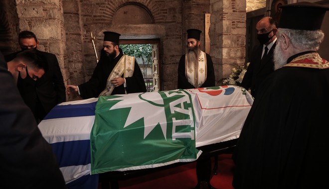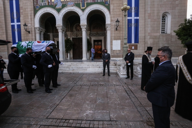 Μάλιστα, το φέρετρο ήταν σκεπασμένο με την ελληνική σημαία, τη σημαία του ΠΑΣΟΚ καθώς και αυτής του Κινήματος Αλλαγής, του κόμματος δηλαδή που εμπνεύστηκε και του οποίου ηγήθηκε μέχρι τέλους παρά τη σοβαρή ασθένεια που αντιμετώπιζε.