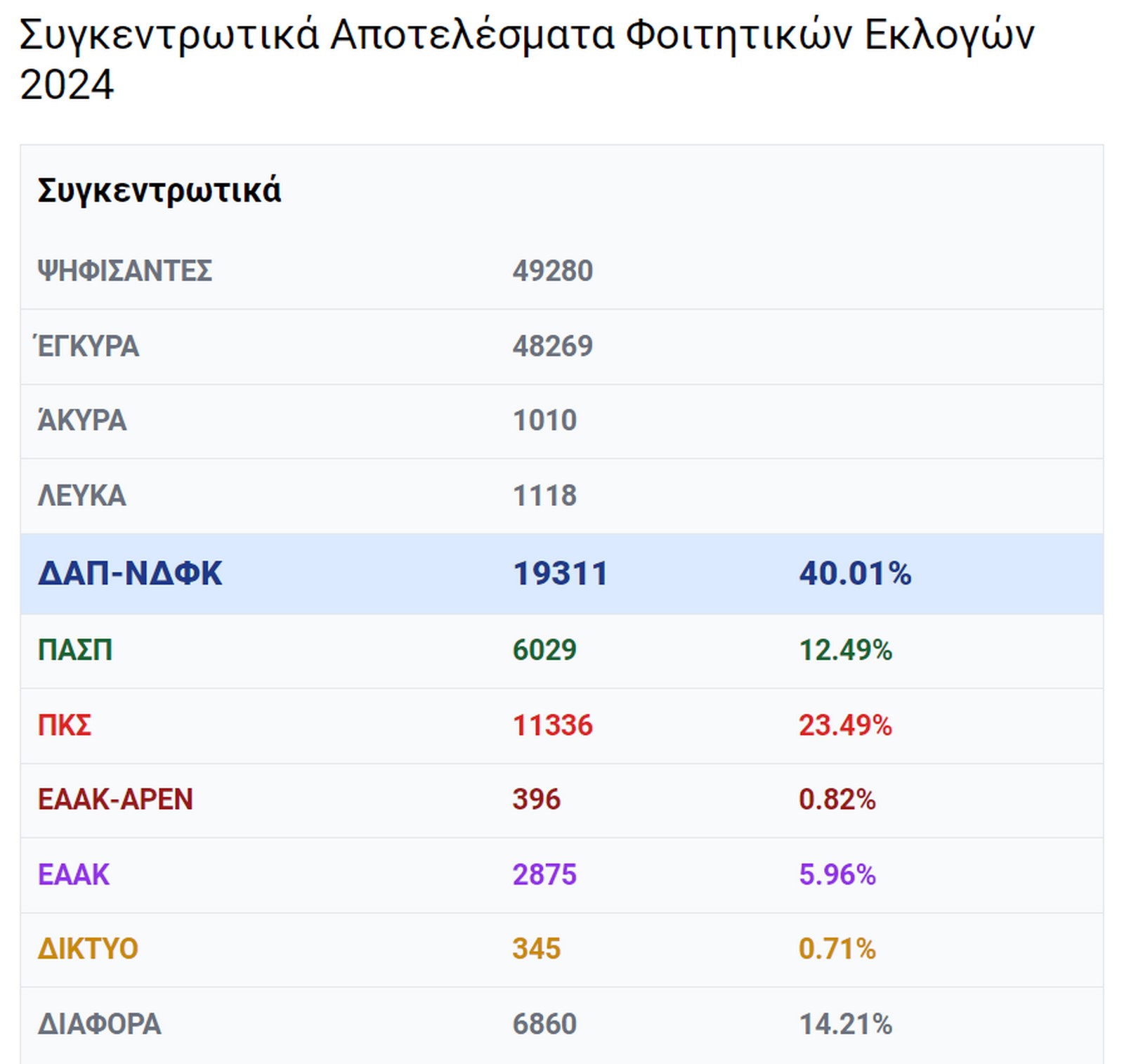 Σύμφωνα με τα συγκεντρωτικά αποτελέσματα της ΔΑΠ-ΝΔΦΚ, η ίδια συγκεντρώνει ποσοστό 40,01% έναντι 23,49% της ΠΚΣ και 12,49% της ΠΑΣΠ.