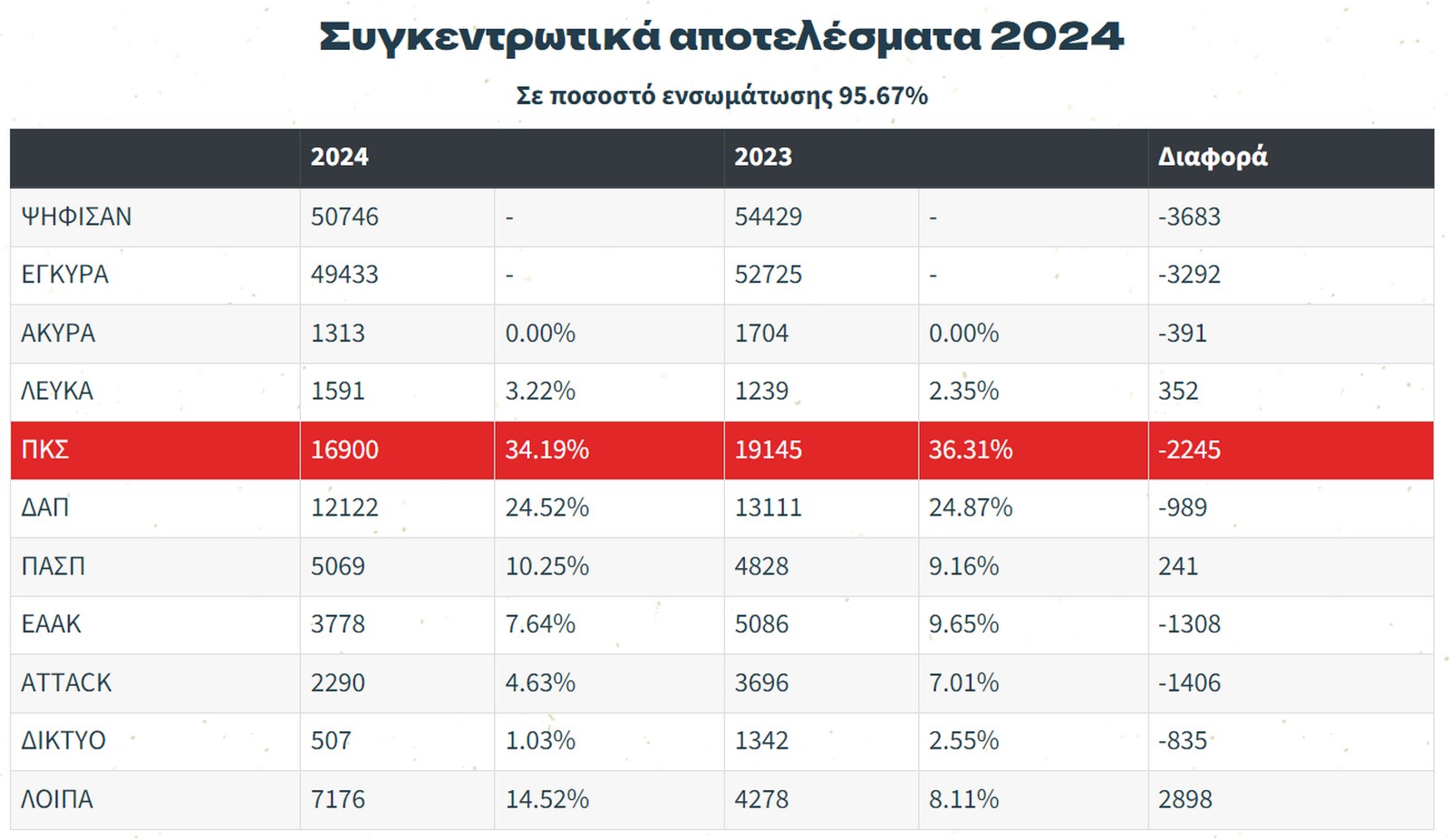 Ειδικότερα, σύμφωνα με τα αποτελέσματα που ανακοινώνει η ΠΚΣ (με το ποσοστό ενσωμάτωσης στο 95%), έρχεται πρώτη με 34,19% έναντι 24,52% της ΔΑΠ-ΝΔΦΚ και 10,25% της ΠΑΣΠ, ενώ ακολουθούν ΕΑΑΚ με 7,64% και ATTACK με 4,63%.