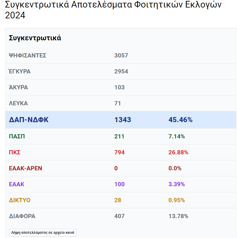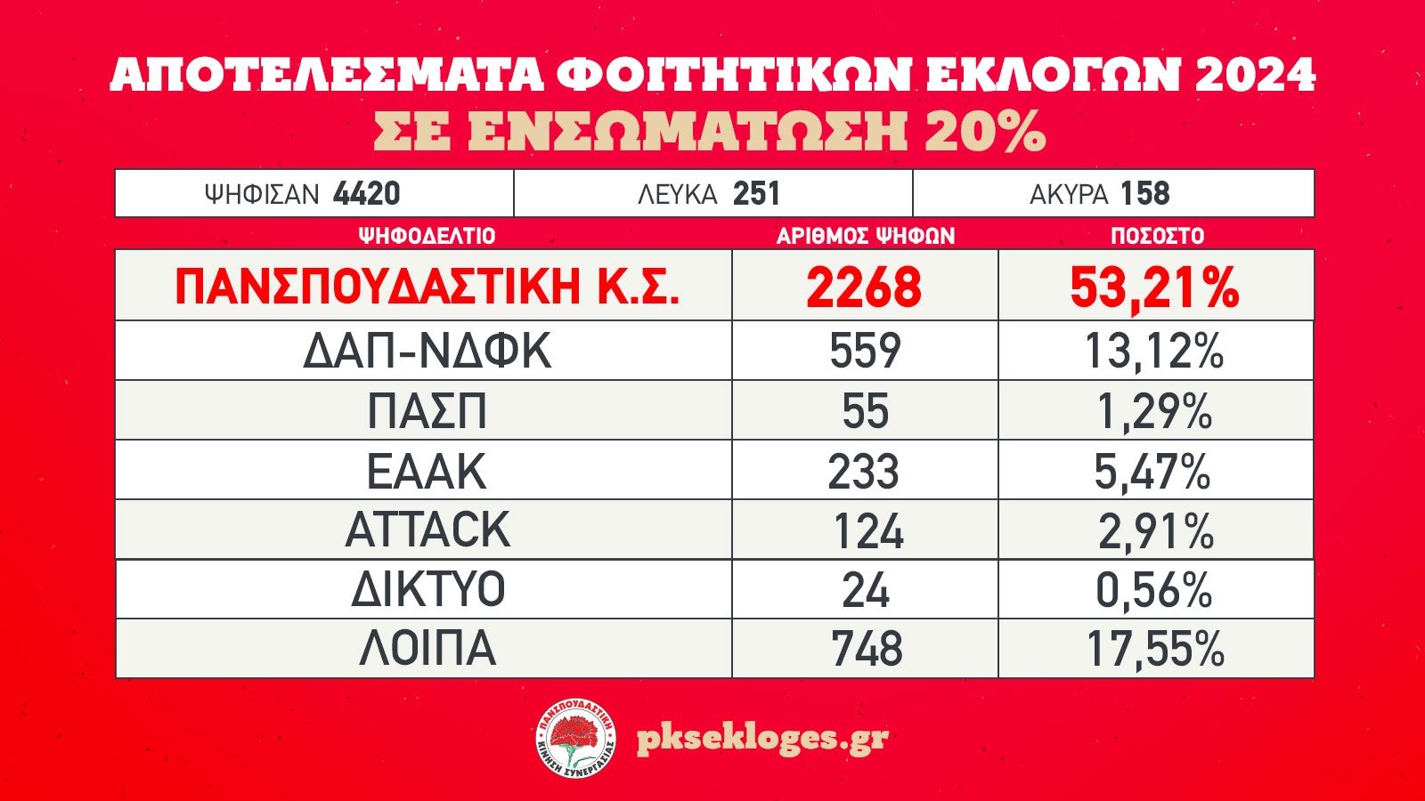 Συγκεντρωτικά αποτελέσματα με ποσοστό ενσωμάτωσης 20%, σύμφωνα πάντα με την Πανσπουδαστική: