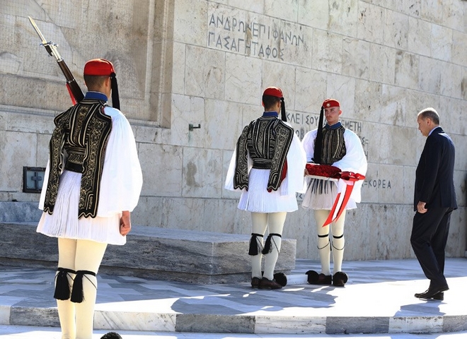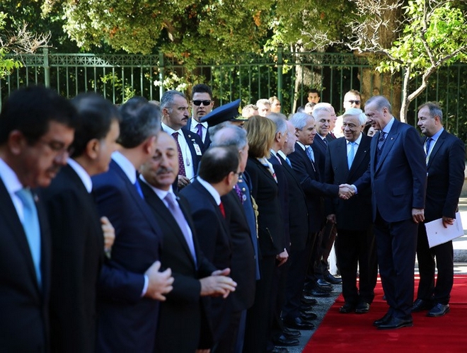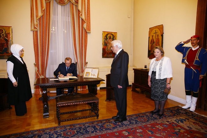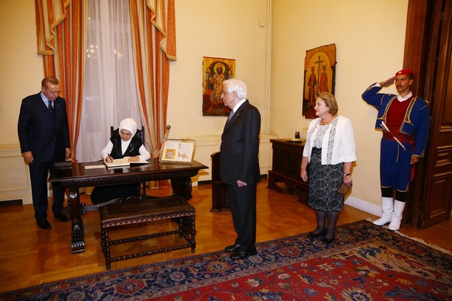 Το ίδιο κάνει και η σύζυγός του Εμινέ παρουσία του Προκόπη Παυλόπουλου και της συζύγου του