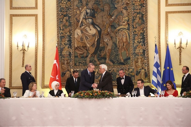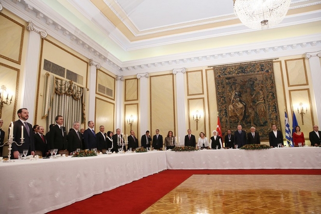 Θερμή χειραψία των δύο Προέδρων κατά το επίσημο γεύμα
