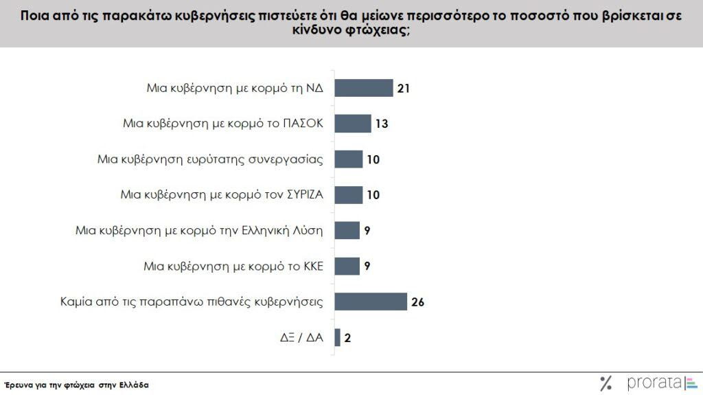 Ο 1 στους 5 ερωτηθέντες θεωρεί ότι μια κυβέρνηση με κορμό τη ΝΔ (21%) θα μπορούσε να μειώσει τη φτώχεια, ενώ έρχεται δεύτερο το ΠΑΣΟΚ (13%) και τρίτη μια κυβέρνηση ευρύτατης συνεργασίας (10%).