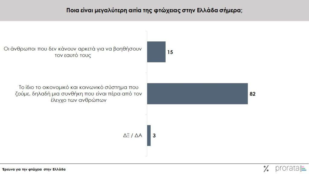 Η συντριπτική πλειονότητα των ερωτηθέντων (82%) θεωρεί ότι το οικονομικό και κοινωνικό σύστημα φταίει για τη φτώχεια. Ένα 15% πιστεύει ότι οι ίδιοι οι άνθρωποι δεν κάνουν αρκετά για να διορθώσουν την κατάστασή τους.