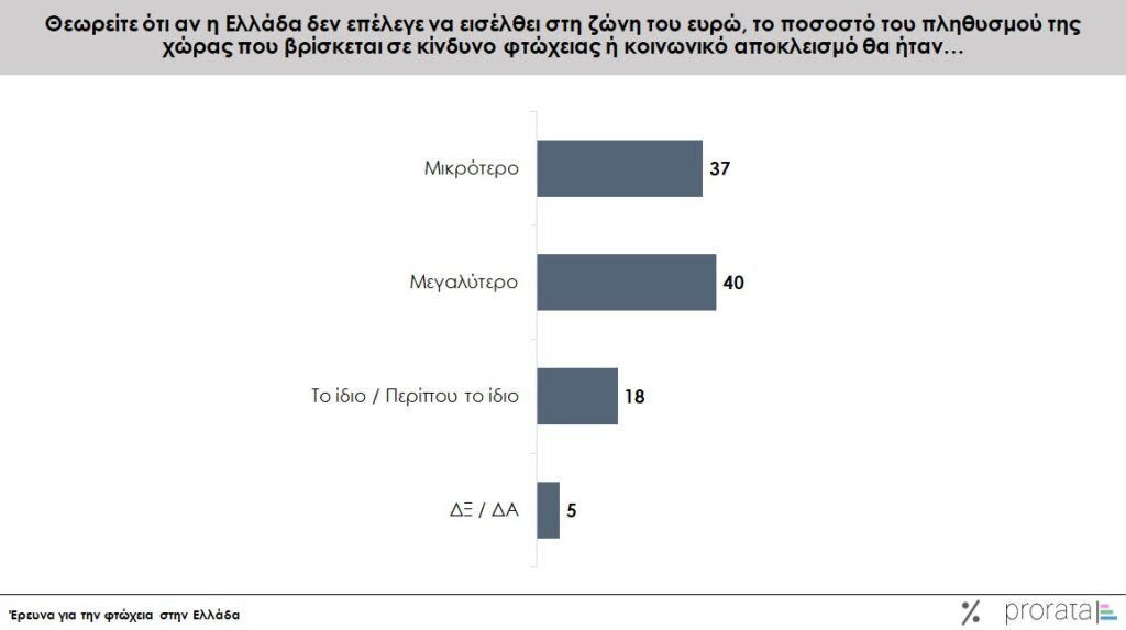 Η ένταξη της Ελλάδας στην Ευρωζώνη αντιμετωπίζεται με σκεπτικισμό από τους πολίτες. Μπορεί οι 4 στους 10να θεωρούν ότι εκτός Ευρωζώνης, περισσότεροι πολίτες θα ήταν αντιμέτωποι με τη φτώχεια, ωστόσο, περίπου το ίδιο ποσοστό (37%) πιστεύουν ότι η κατάσταση θα ήταν καλύτερη.