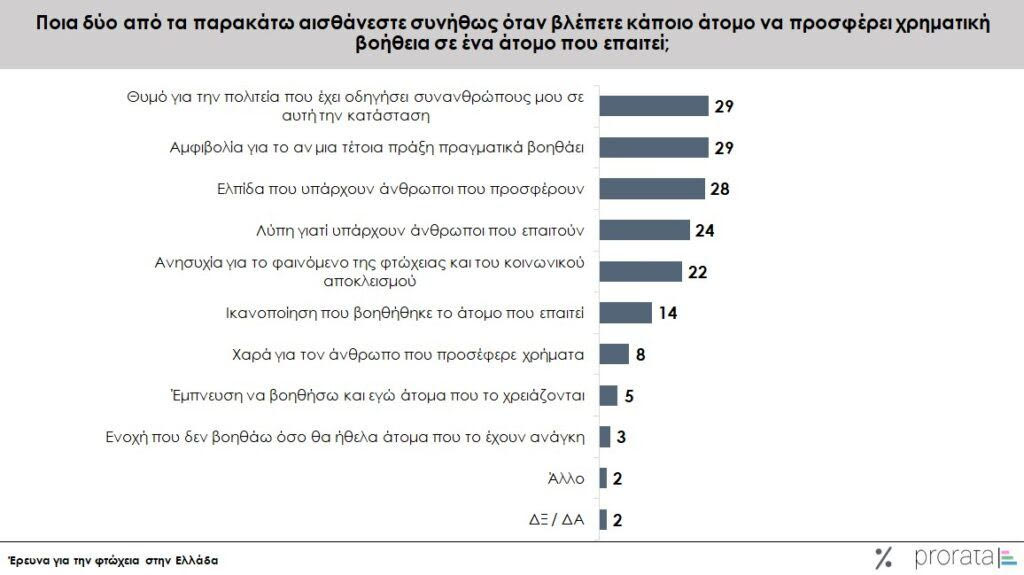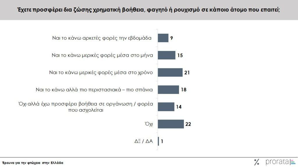 Το 45% των ερωτηθέντων έχει προσφέρει χρήματα, φαγητό ή ρουχισμό σε άτομο που επαιτεί, με μικρότερη ή μεγαλύτερη συχνότητα. Ένα 14% βοηθάει με εναλλακτικούς τρόπους, προσφέροντας βοήθεια σε φορείς. Ωστόσο, υπάρχει και ένα 22% που δεν έχει προσφέρει τον οβολόν του ποτέ.