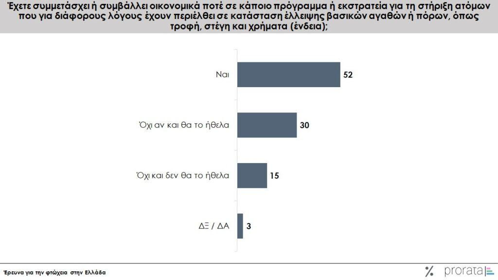 Ένα 52% έχει προσφέρει βοήθεια σε κάποιο πρόγραμμα για τη στήριξη ατόμων σε ανάγκη, ενώ ένα 30% απαντάει πως δεν το έχει κάνει, αν και θα το ήθελε.