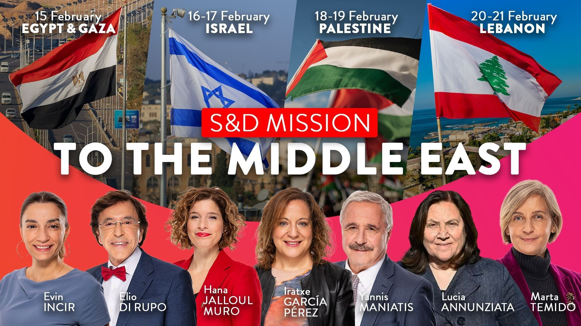 Αντιπροσωπεία των Ευρωπαίων Σοσιαλιστών και Δημοκρατών (S&D), με επικεφαλής την Πρόεδρο Iratxe García και τον Αντιπρόεδρο Γιάννη Μανιάτη, ταξιδεύει στη Μέση Ανατολή – Αίγυπτο, Ισραήλ, Παλαιστίνη και Λίβανο – από τις 15 έως τις 21 Φεβρουαρίου, λίγες ημέρες πριν από τη λήξη της πρώτης φάσης της συμφωνίας μεταξύ της ισραηλινής κυβέρνησης και της Χαμάς για την κατάπαυση του πυρός και την απελευθέρωση των ομήρων.