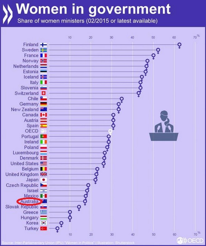 Στις πρώτες θέσεις του γραφήματος βρίσκονται η Φινλανδία, η Σουηδία και η Γαλλία, των οποίων οι κυβερνήσεις απαρτίζονται από μεγάλο αριθμό γυναικών υπουργών. Παράλληλα, στις τελευταίες θέσεις βρίσκονται η Ουγγαρία, η Κορέα και η Τουρκία, όπου ο αριθμός των γυναικών που συμμετέχουν στην εκάστοτε κυβέρνηση βρίσκεται κάτω από το 10%.