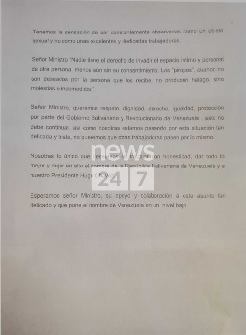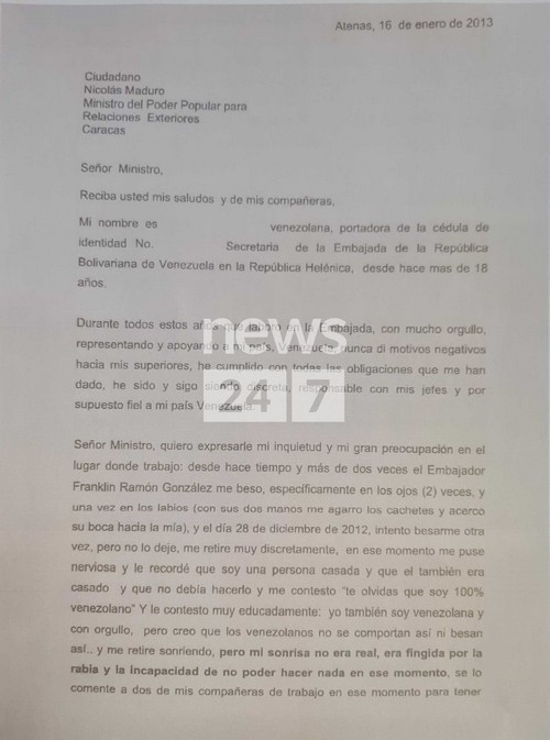 Μία από τις επιστολές αυτές, που αποκαλύπτει το NEWS 24/7, “έφυγε” από την Αθήνα στις 16 Ιανουαρίου του 2013. Σ’ αυτήν η υπάλληλος της πρεσβείας περιγράφει αναλυτικά τις παρενοχλήσεις από τον πρέσβη, επισημαίνει ότι εκπροσωπεί και τις ελληνίδες συναδέλφισσές της και ζητά από τον Μαδούρο να παρέμβει έτσι ώστε η απαράδεκτη εκείνη κατάσταση να σταματήσει.