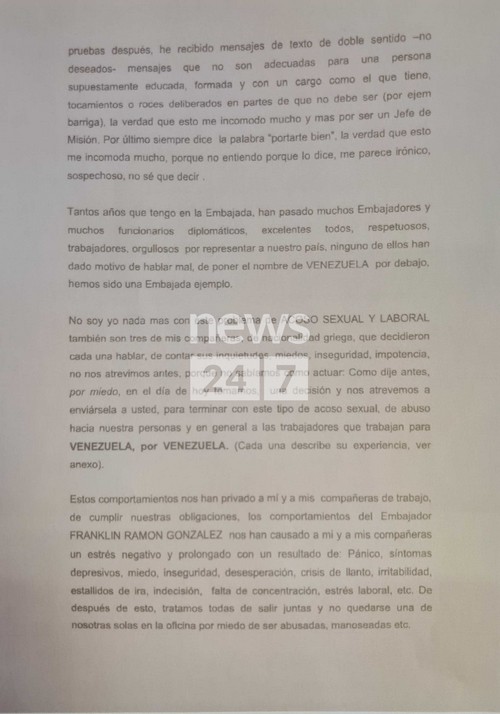 Κύριε Υπουργέ, θέλω να σας εκφράσω τη δυσαρέσκεια και τη μεγάλη ανησυχία μου στον εργασιακό μου χώρο: εδώ και κάποιο καιρό και περισσότερες από δυο φορές, ο Πρέσβης Φράνκλιν Ραμόν Γκονσάλες με φίλησε, συγκεκριμένα στα μάτια (2 φορές) και μια φορά στα χείλη (με τα δυο του χέρια, μού έπιασε τα μάγουλα και πλησίασε το στόμα του στο δικό μου) και στις 28 Δεκεμβρίου του 2012, προσπάθησε να με φιλήσει ξανά, αλλά δεν τον άφησα, αποσύρθηκα πολύ διακριτικά, εκείνη τη στιγμή με έπιασε νευρικότητα και του υπενθύμισα ότι είμαι παντρεμένη και πως και εκείνος είναι παντρεμένος και πως δεν θα έπρεπε να κάνει κάτι τέτοιο και εκείνος μου απάντησε “ξεχνάς πως είμαι 100% Βενεζουελάνος”. Του απάντησα πολύ ευγενικά: κι εγώ είμαι Βενεζουελάνα και πολύ υπερήφανη για αυτό, αλλά πιστεύω ότι οι Βενεζουελάνοι δεν συμπεριφέρονται έτσι, ούτε φιλάνε με αυτόν τον τρόπο. Και αποσύρθηκα χαμογελώντας, αλλά το χαμόγελό μου δεν ήταν πραγματικό, αλλά προσποιητό λόγω της οργής και της αδυναμίας μου να αντιδράσω με οποιονδήποτε τρόπο εκείνη τη στιγμή.