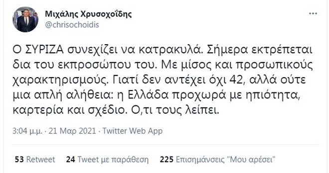 “Ο ΣΥΡΙΖΑ συνεχίζει να κατρακυλά. Σήμερα εκτρέπεται δια του εκπροσώπου του. Με μίσος και προσωπικούς χαρακτηρισμούς. Γιατί δεν αντέχει όχι 42, αλλά ούτε μια απλή αλήθεια: η Ελλάδα προχωρά με ηπιότητα, καρτερία και σχέδιο. Ο,τι τους λείπει”.