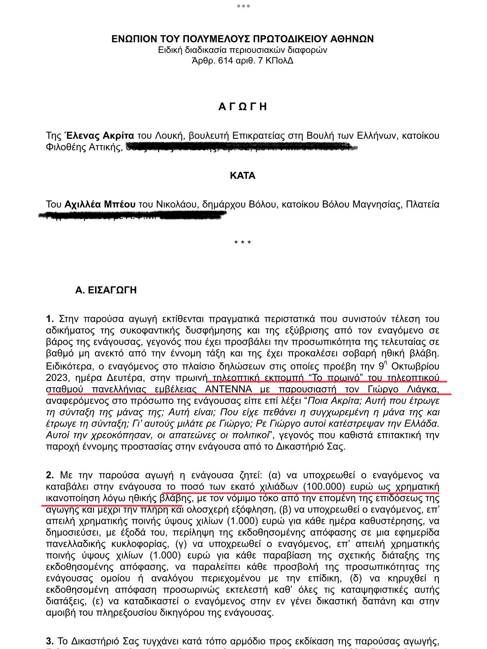Η Έλενα Ακρίτα, μέσω του δικηγόρου της Βασίλη Σωτηρόπουλου, κατέθεσε ήδη αγωγή για συκοφαντική δυσφήμιση και εξύβριση κατά του δημάρχου του Βόλου, ο οποίος καλεσμένος σε πρωινή τηλεοπτική εκπομπή του ΑΝΤ1 εξαπέλυσε μια χυδαία -αν και δυστυχώς όχι πρωτοφανή για τον ίδιο- επίθεση προς τη βουλευτή Επικρατείας, επιχειρώντας με ύβρεις και αδίστακτα ψεύδη να την απαξιώσει και να σπιλώσει την τιμή και την υπόληψή της.