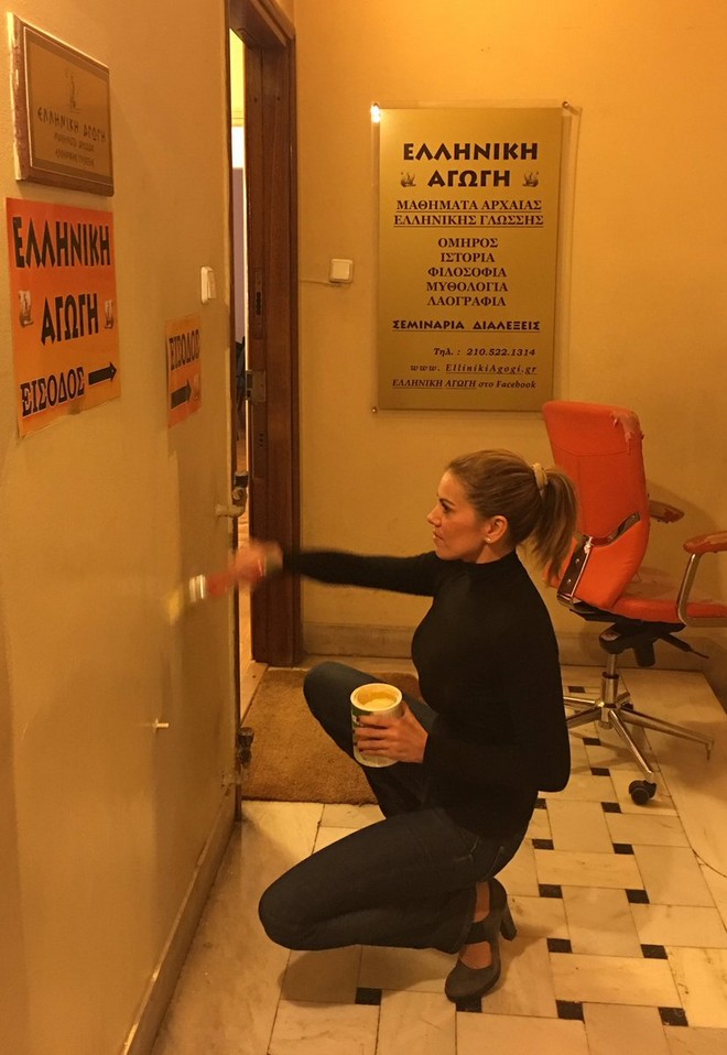 Με μπογιά και πινέλο εμφανίστηκε η Ευγενία Μανωλίδου το πρωί της Παρασκευής στην είσοδο της Σχολής Αρχαίων Ελληνικών που διατηρεί ο σύζυγός της, αντιπρόεδρος της ΝΔ, Άδωνις Γεωργιάδης, στα Εξάρχεια προκειμένου να σβήσει το “Α”, το γνωστό σύμβολο της αναρχίας που έβαψαν το απόγευμα της Πέμπτης με σπρέι, αντιεξουσιαστές.